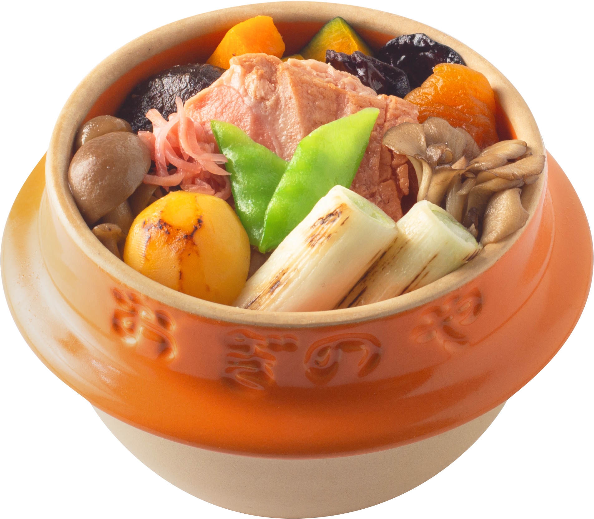 栗の炊き込みご飯(お米、もち米、栗甘露煮、食塩)、合鴨のロースト、舞茸の揚げ浸し、しめじの揚げ浸し、かぼちゃ煮、椎茸煮、焼き長葱、きくらげのきんぴら、焼き栗、杏子甘煮、茹できぬさや、しょうが酢漬、付合せ(漬物) |