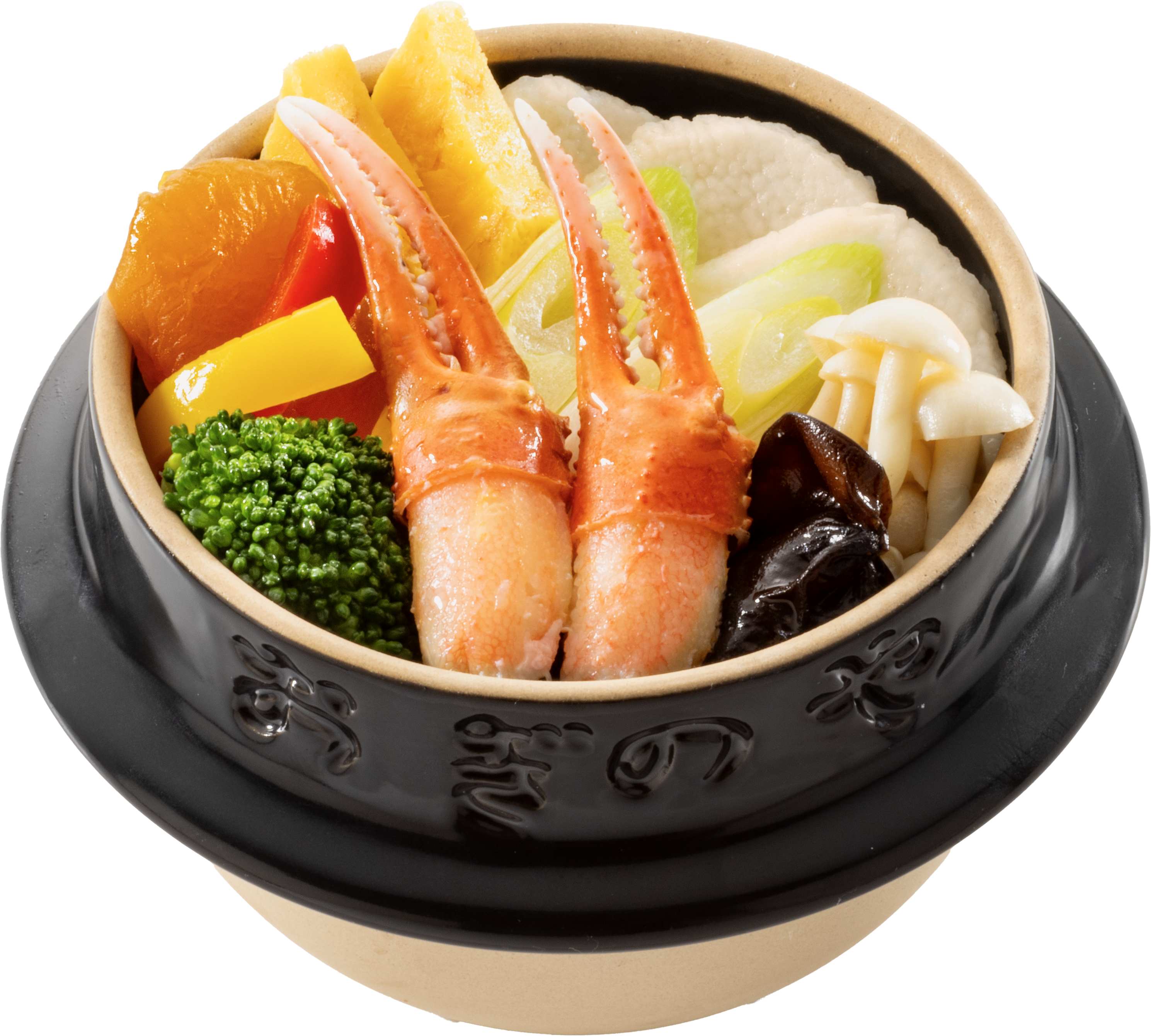 黒い陶器の釜の中央に鎮座する、2本の紅ズワイ蟹の爪。