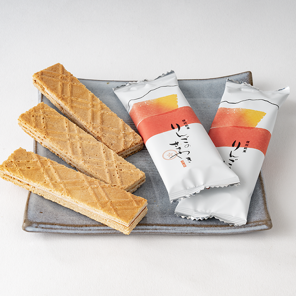 長野県産のりんごとホワイトチョコレートを生地に練り込んだ、サクサク食感の薄焼きクッキーです。